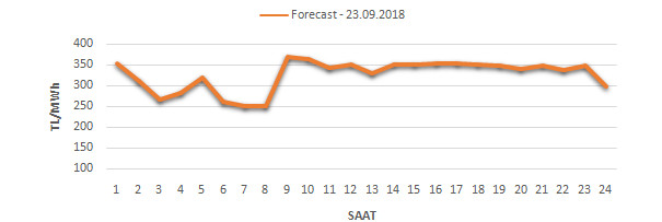 Yarından sonraki gün için oluşacak ortalama piyasa takas fiyatı 325,87TL/MWH olarak tahmin edilmektedir. Buna bağlı olarak günün maksimum fiyatı 368,33TL/MWh olarak 08:00 – 09:00saat aralığında, minimum fiyatı 250,00TL/MWh olarak 06:00 – 07:00saat aralığında gerçekleşeceği öngörülmektedir. Puant saatlerde (17:00 – 22:00) tahmini ortalama piyasa takas fiyatı ise 345,37 TL/MWh olarak hesaplanabilmektedir.Saatlik oluşacak piyasa takas fiyatı tahminleri aşağıdaki grafikte yer almaktadır.