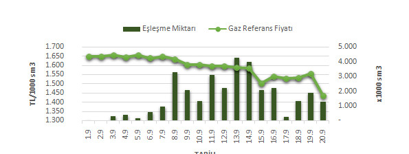 Organize Toptan Doğal Gaz Satış Piyasası (OTSP) dahilinde 01.09.2018 – 20.09.2018 tarihleri arasıortalama Gaz Referans Fiyatı (GRF)1.592,45 TL/1000 sm3olarak belirlenirken, aynı tarihler arasında toplam gerçekleşeneşleşmelerin miktarı ise 31.409 x1000 sm3olarak belirlendi. İlgili tarihler arasında günlük Gaz Referans Fiyatı (GRF) ile Eşleşme Miktarı verileri aşağıdaki grafikte yer almaktadır.