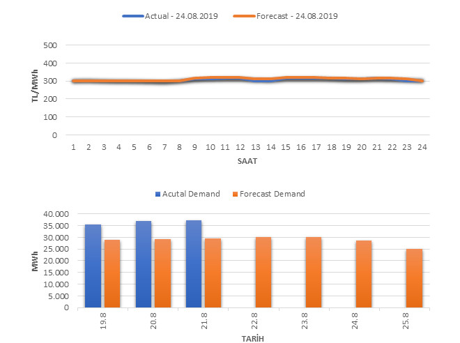 Tahminleme Modeli* analizi sonucu ortalama piyasa takas fiyatı 312.76 TL/MWh ve ortalama tüketim 28,614 MWh olarak öngörülmektedir. Modelin piyasa takas fiyatına dair başarı oranı günlük % 84, tüketime dair başarı oranı** ise günlük % 80 olarak hesaplanırken, bugüne kadar yapılan piyasa takas fiyatına dair analizlere göre başarı oranı % 91, tüketime dair başarı oranı ise % 94 olarak hesaplanmaktadır. Saatlik yarın için oluşan ve tahmin edilen piyasa takas fiyatları ile haftalık bazda tahmin edilen ve gerçekleştikçe yer alacak günlük ortalama tüketim değerleri aşağıdaki grafiklerde yer almaktadır.