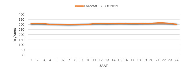 Yarından sonraki gün için oluşacak ortalama piyasa takas fiyatı 309.2 TL/MWH olarak tahmin edilmektedir. Buna bağlı olarak günün maksimum fiyatı 315.56 TL/MWh olarak 20:00 – 21:00 saat aralığında, minimum fiyatı 299.98 TL/MWh olarak 06:00 – 07:00 saat aralığında gerçekleşeceği öngörülmektedir. Puant saatlerde (17:00 – 22:00) tahmini ortalama piyasa takas fiyatı ise 312.98 TL/MWh olarak hesaplanabilmektedir. Saatlik oluşacak piyasa takas fiyatı tahminleri aşağıdaki grafikte yer almaktadır.