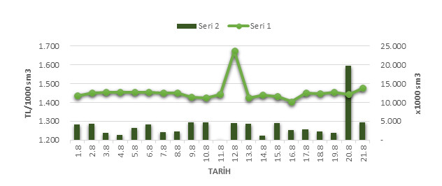 Organize Toptan Doğal Gaz Satış Piyasası (OTSP) dahilinde 01.08.2019 – 22.08.2019 tarihleri arası ortalama Gaz Referans Fiyatı (GRF) 1,457.41 TL/1000 sm3 olarak belirlenirken, aynı tarihler arasında toplam gerçekleşen eşleşmelerin miktarı ise 88,198 x1000 sm3 olarak belirlendi. İlgili tarihler arasında günlük Gaz Referans Fiyatı (GRF) ile Eşleşme Miktarı verileri aşağıdaki grafikte yer almaktadır.