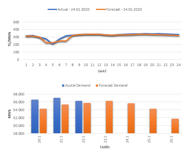 Tahminleme Modeli* analizi sonucu ortalama piyasa takas fiyatı 310.18 TL/MWh ve ortalama tüketim 35,666 MWh olarak öngörülmektedir. Modelin piyasa takas fiyatına dair başarı oranı günlük % 85, tüketime dair başarı oranı** ise günlük % 99 olarak hesaplanırken, bugüne kadar yapılan piyasa takas fiyatına dair analizlere göre başarı oranı % 91, tüketime dair başarı oranı ise % 94 olarak hesaplanmaktadır. Saatlik yarın için oluşan ve tahmin edilen piyasa takas fiyatları ile haftalık bazda tahmin edilen ve gerçekleştikçe yer alacak günlük ortalama tüketim değerleri aşağıdaki grafiklerde yer almaktadır.