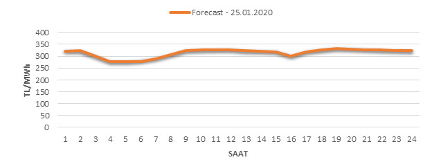 Yarından sonraki gün için oluşacak ortalama piyasa takas fiyatı 314.09 TL/MWH olarak tahmin edilmektedir. Buna bağlı olarak günün maksimum fiyatı 331.92 TL/MWh olarak 18:00 – 19:00 saat aralığında, minimum fiyatı 275.89 TL/MWh olarak 03:00 – 04:00 saat aralığında gerçekleşeceği öngörülmektedir. Puant saatlerde (17:00 – 22:00) tahmini ortalama piyasa takas fiyatı ise 327.19 TL/MWh olarak hesaplanabilmektedir. Saatlik oluşacak piyasa takas fiyatı tahminleri aşağıdaki grafikte yer almaktadır.