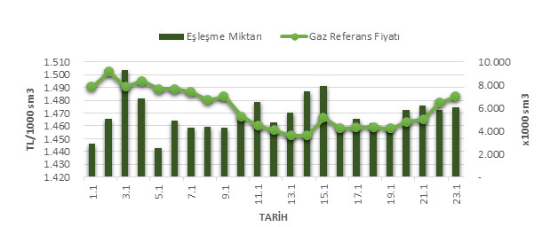 Organize Toptan Doğal Gaz Satış Piyasası (OTSP) dahilinde 01.01.2020 – 23.01.2020 tarihleri arası ortalama Gaz Referans Fiyatı (GRF) 1,473.23 TL/1000 sm3 olarak belirlenirken, aynı tarihler arasında toplam gerçekleşen eşleşmelerin miktarı ise 124,750 x1000 sm3 olarak belirlendi. İlgili tarihler arasında günlük Gaz Referans Fiyatı (GRF) ile Eşleşme Miktarı verileri aşağıdaki grafikte yer almaktadır.