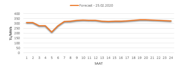 Yarından sonraki gün için oluşacak ortalama piyasa takas fiyatı 316.47 TL/MWH olarak tahmin edilmektedir. Buna bağlı olarak günün maksimum fiyatı 338.34 TL/MWh olarak 19:00 – 20:00 saat aralığında, minimum fiyatı 212.18 TL/MWh olarak 04:00 – 05:00 saat aralığında gerçekleşeceği öngörülmektedir. Puant saatlerde (17:00 – 22:00) tahmini ortalama piyasa takas fiyatı ise 334.72 TL/MWh olarak hesaplanabilmektedir. Saatlik oluşacak piyasa takas fiyatı tahminleri aşağıdaki grafikte yer almaktadır.