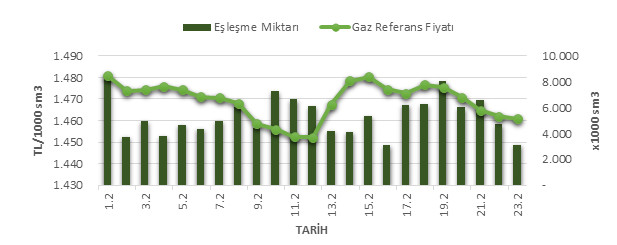 Organize Toptan Doğal Gaz Satış Piyasası (OTSP) dahilinde 01.01.2020 – 23.02.2020 tarihleri arası ortalama Gaz Referans Fiyatı (GRF) 1,469.19 TL/1000 sm3 olarak belirlenirken, aynı tarihler arasında toplam gerçekleşen eşleşmelerin miktarı ise 123,311 x1000 sm3 olarak belirlendi. İlgili tarihler arasında günlük Gaz Referans Fiyatı (GRF) ile Eşleşme Miktarı verileri aşağıdaki grafikte yer almaktadır.