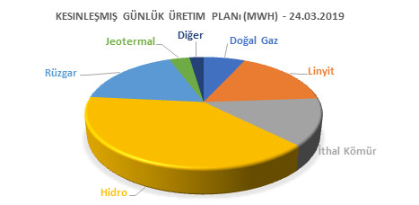 Bir önceki gün ile kıyaslandığında ortalama piyasa takas fiyatında –130.87 TL düşüş gözlemlenmektedir. Kesinleşmiş Günlük Üretim Planı (KGÜP) verilerine bakıldığında termik enerji dahilinde doğal gaz % 7, linyit % 17, ithal kömür % 14 oranında üretimin gerçekleşmesi beklenirken, yenilenebilir enerji dahilinde ise hidro % 39, rüzgar % 18, jeotermal % 3 oranında üretimin gerçekleşmesi beklenmektedir. Bununla birlikte fiyatlardaki düşüş, hafta sonu olmasından dolayı tüketim talebindeki düşüş ve yenilenebilir enerji santrallerinde üretim artış beklentisi ile açıklanabilmektedir. Yarın için planlanan üretim bazlı Kesinleşmiş Günlük Üretim Planı (KGÜP) aşağıdaki grafikte yer almaktadır.