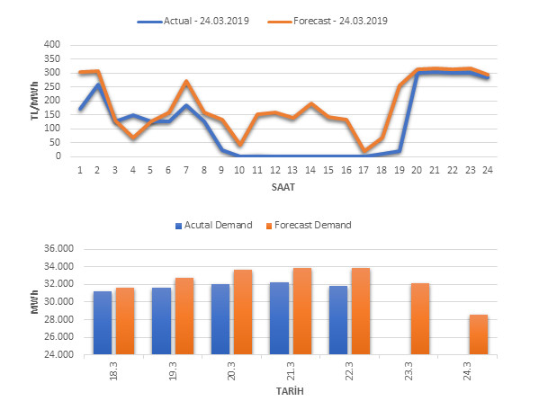 Tahminleme Modeli* analizi sonucu ortalama piyasa takas fiyatı 187.73 TL/MWh ve ortalama tüketim 28,609 MWh olarak öngörülmektedir. Modelin piyasa takas fiyatına dair başarı oranı günlük % 67, tüketime dair başarı oranı** ise günlük % 94 olarak hesaplanırken, bugüne kadar yapılan piyasa takas fiyatına dair analizlere göre başarı oranı % 88, tüketime dair başarı oranı ise % 95 olarak hesaplanmaktadır. Saatlik yarın için oluşan ve tahmin edilen piyasa takas fiyatları ile haftalık bazda tahmin edilen ve gerçekleştikçe yer alacak günlük ortalama tüketim değerleri aşağıdaki grafiklerde yer almaktadır.