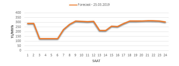 Yarından sonraki gün için oluşacak ortalama piyasa takas fiyatı 258.8 TL/MWH olarak tahmin edilmektedir. Buna bağlı olarak günün maksimum fiyatı 315.4 TL/MWh olarak 20:00 – 21:00 saat aralığında, minimum fiyatı 125.53 TL/MWh olarak 05:00 – 06:00 saat aralığında gerçekleşeceği öngörülmektedir. Puant saatlerde (17:00 – 22:00) tahmini ortalama piyasa takas fiyatı ise 313.06 TL/MWh olarak hesaplanabilmektedir. Saatlik oluşacak piyasa takas fiyatı tahminleri aşağıdaki grafikte yer almaktadır.