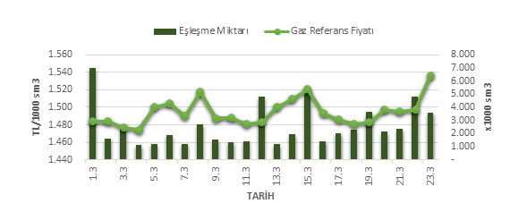 Organize Toptan Doğal Gaz Satış Piyasası (OTSP) dahilinde 01.03.2019 – 23.03.2019 tarihleri arası ortalama Gaz Referans Fiyatı (GRF) 1,494.52 TL/1000 sm3 olarak belirlenirken, aynı tarihler arasında toplam gerçekleşen eşleşmelerin miktarı ise 58,884 x1000 sm3 olarak belirlendi. İlgili tarihler arasında günlük Gaz Referans Fiyatı (GRF) ile Eşleşme Miktarı verileri aşağıdaki grafikte yer almaktadır.