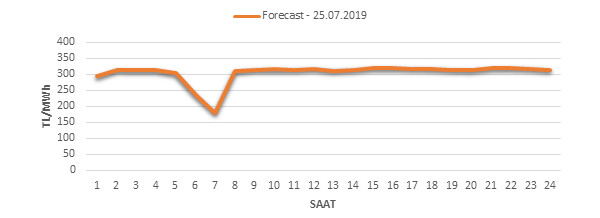 Yarından sonraki gün için oluşacak ortalama piyasa takas fiyatı 303.39 TL/MWH olarak tahmin edilmektedir. Buna bağlı olarak günün maksimum fiyatı 318.04 TL/MWh olarak 15:0016:00 saat aralığında, minimum fiyatı 180 TL/MWh olarak 06:0007:00 saat aralığında gerçekleşeceği öngörülmektedir. Puant saatlerde (17:0022:00) tahmini ortalama piyasa takas fiyatı ise 315.18 TL/MWh olarak hesaplanabilmektedir. Saatlik oluşacak piyasa takas fiyatı tahminleri aşağıdaki grafikte yer almaktadır.