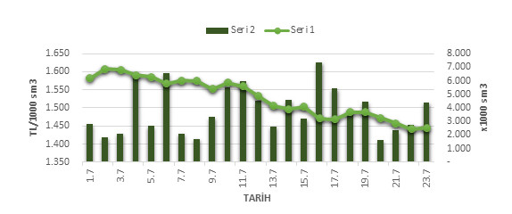 Organize Toptan Doğal Gaz Satış Piyasası (OTSP) dahilinde 01.07.201923.07.2019 tarihleri arası ortalama Gaz Referans Fiyatı (GRF) 1,527.89 TL/1000 sm3 olarak belirlenirken, aynı tarihler arasında toplam gerçekleşen eşleşmelerin miktarı ise 87,807 x1000 sm3 olarak belirlendi. İlgili tarihler arasında günlük Gaz Referans Fiyatı (GRF) ile Eşleşme Miktarı verileri aşağıdaki grafikte yer almaktadır.