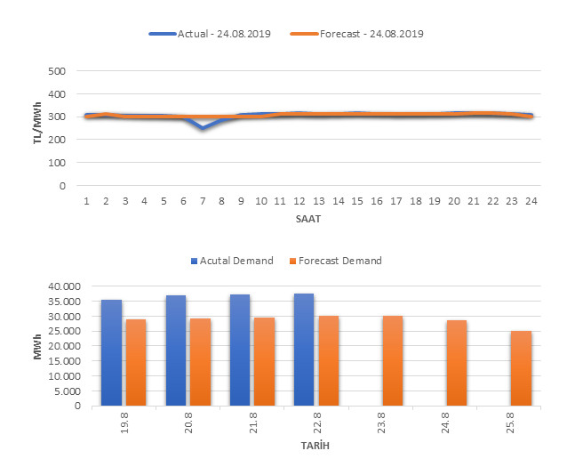 Tahminleme Modeli* analizi sonucu ortalama piyasa takas fiyatı 309.2 TL/MWh ve ortalama tüketim 28,614 MWh olarak öngörülmektedir. Modelin piyasa takas fiyatına dair başarı oranı günlük % 83, tüketime dair başarı oranı** ise günlük % 80 olarak hesaplanırken, bugüne kadar yapılan piyasa takas fiyatına dair analizlere göre başarı oranı % 91, tüketime dair başarı oranı ise % 94 olarak hesaplanmaktadır. Saatlik yarın için oluşan ve tahmin edilen piyasa takas fiyatları ile haftalık bazda tahmin edilen ve gerçekleştikçe yer alacak günlük ortalama tüketim değerleri aşağıdaki grafiklerde yer almaktadır.