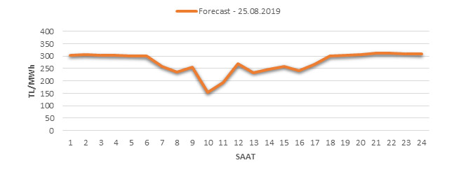 Yarından sonraki gün için oluşacak ortalama piyasa takas fiyatı 274.98 TL/MWH olarak tahmin edilmektedir. Buna bağlı olarak günün maksimum fiyatı 312.61 TL/MWh olarak 20:00 – 21:00 saat aralığında, minimum fiyatı 152.44 TL/MWh olarak 09:00 – 10:00 saat aralığında gerçekleşeceği öngörülmektedir. Puant saatlerde (17:00 – 22:00) tahmini ortalama piyasa takas fiyatı ise 307.68 TL/MWh olarak hesaplanabilmektedir. Saatlik oluşacak piyasa takas fiyatı tahminleri aşağıdaki grafikte yer almaktadır.