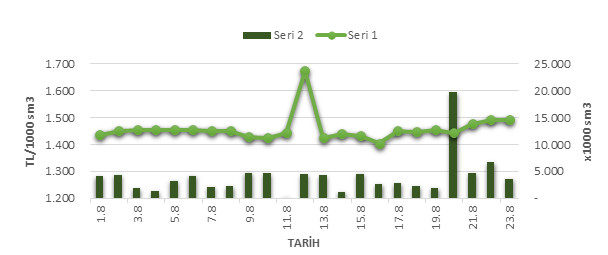 Organize Toptan Doğal Gaz Satış Piyasası (OTSP) dahilinde 01.08.2019 – 23.08.2019 tarihleri arası ortalama Gaz Referans Fiyatı (GRF) 1,458.98 TL/1000 sm3 olarak belirlenirken, aynı tarihler arasında toplam gerçekleşen eşleşmelerin miktarı ise 92,096 x1000 sm3 olarak belirlendi. İlgili tarihler arasında günlük Gaz Referans Fiyatı (GRF) ile Eşleşme Miktarı verileri aşağıdaki grafikte yer almaktadır.