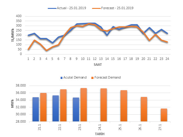 Tahminleme Modeli* analizi sonucu ortalama piyasa takas fiyatı 209.45 TL/MWh ve ortalama tüketim 36,714 MWh olarak öngörülmektedir. Modelin piyasa takas fiyatına dair başarı oranı günlük % 69, tüketime dair başarı oranı** ise günlük % 92 olarak hesaplanırken, bugüne kadar yapılan piyasa takas fiyatına dair analizlere göre başarı oranı % 88, tüketime dair başarı oranı ise % 94 olarak hesaplanmaktadır. Saatlik yarın için oluşan ve tahmin edilen piyasa takas fiyatları ile haftalık bazda tahmin edilen ve gerçekleştikçe yer alacak günlük ortalama tüketim değerleri aşağıdaki grafiklerde yer almaktadır.