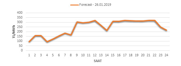 Yarından sonraki gün için oluşacak ortalama piyasa takas fiyatı 243.7 TL/MWH olarak tahmin edilmektedir. Buna bağlı olarak günün maksimum fiyatı 321.14 TL/MWh olarak 20:00 – 21:00 saat aralığında, minimum fiyatı 93.33 TL/MWh olarak 03:00 – 04:00 saat aralığında gerçekleşeceği öngörülmektedir. Puant saatlerde (17:00 – 22:00) tahmini ortalama piyasa takas fiyatı ise 306.76 TL/MWh olarak hesaplanabilmektedir. Saatlik oluşacak piyasa takas fiyatı tahminleri aşağıdaki grafikte yer almaktadır.