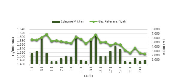 Organize Toptan Doğal Gaz Satış Piyasası (OTSP) dahilinde 01.12.2018 – 24.01.2019 tarihleri arası ortalama Gaz Referans Fiyatı (GRF) 1,570.47 TL/1000 sm3 olarak belirlenirken, aynı tarihler arasında toplam gerçekleşen eşleşmelerin miktarı ise 60,344 x1000 sm3 olarak belirlendi. İlgili tarihler arasında günlük Gaz Referans Fiyatı (GRF) ile Eşleşme Miktarı verileri aşağıdaki grafikte yer almaktadır.