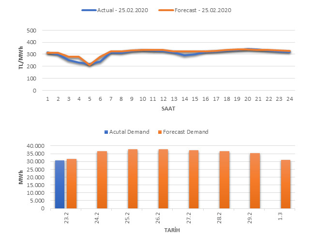 Tahminleme Modeli* analizi sonucu ortalama piyasa takas fiyatı 316.47 TL/MWh ve ortalama tüketim 37,645 MWh olarak öngörülmektedir. Modelin piyasa takas fiyatına dair başarı oranı günlük % 87, tüketime dair başarı oranı** ise günlük % 97 olarak hesaplanırken, bugüne kadar yapılan piyasa takas fiyatına dair analizlere göre başarı oranı % 91, tüketime dair başarı oranı ise % 94 olarak hesaplanmaktadır. Saatlik yarın için oluşan ve tahmin edilen piyasa takas fiyatları ile haftalık bazda tahmin edilen ve gerçekleştikçe yer alacak günlük ortalama tüketim değerleri aşağıdaki grafiklerde yer almaktadır.