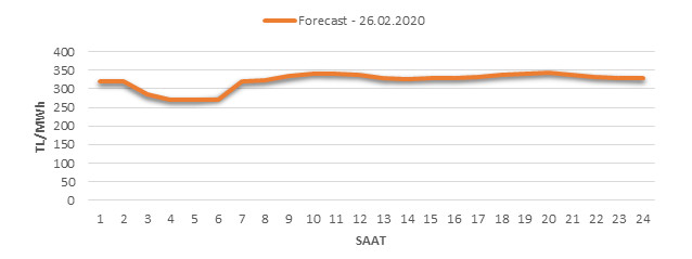 Yarından sonraki gün için oluşacak ortalama piyasa takas fiyatı 323.24 TL/MWH olarak tahmin edilmektedir. Buna bağlı olarak günün maksimum fiyatı 344.62 TL/MWh olarak 19:00 – 20:00 saat aralığında, minimum fiyatı 272 TL/MWh olarak 04:00 – 05:00 saat aralığında gerçekleşeceği öngörülmektedir. Puant saatlerde (17:00 – 22:00) tahmini ortalama piyasa takas fiyatı ise 338.24 TL/MWh olarak hesaplanabilmektedir. Saatlik oluşacak piyasa takas fiyatı tahminleri aşağıdaki grafikte yer almaktadır.
