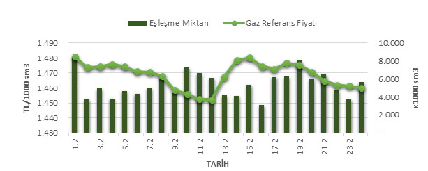 Organize Toptan Doğal Gaz Satış Piyasası (OTSP) dahilinde 01.01.2020 – 24.02.2020 tarihleri arası ortalama Gaz Referans Fiyatı (GRF) 1,468.83 TL/1000 sm3 olarak belirlenirken, aynı tarihler arasında toplam gerçekleşen eşleşmelerin miktarı ise 129,550 x1000 sm3 olarak belirlendi. İlgili tarihler arasında günlük Gaz Referans Fiyatı (GRF) ile Eşleşme Miktarı verileri aşağıdaki grafikte yer almaktadır.
