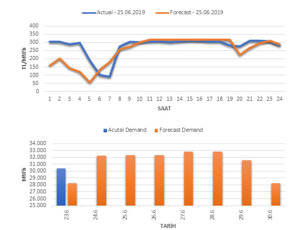 Tahminleme Modeli* analizi sonucu ortalama piyasa takas fiyatı 253.15 TL/MWh ve ortalama tüketim 32,300 MWh olarak öngörülmektedir. Modelin piyasa takas fiyatına dair başarı oranı günlük % 68, tüketime dair başarı oranı** ise günlük % 93 olarak hesaplanırken, bugüne kadar yapılan piyasa takas fiyatına dair analizlere göre başarı oranı % 89, tüketime dair başarı oranı ise % 95 olarak hesaplanmaktadır. Saatlik yarın için oluşan ve tahmin edilen piyasa takas fiyatları ile haftalık bazda tahmin edilen ve gerçekleştikçe yer alacak günlük ortalama tüketim değerleri aşağıdaki grafiklerde yer almaktadır.