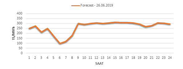 Yarından sonraki gün için oluşacak ortalama piyasa takas fiyatı 264.03 TL/MWH olarak tahmin edilmektedir. Buna bağlı olarak günün maksimum fiyatı 311.85 TL/MWh olarak 14:00 – 15:00 saat aralığında, minimum fiyatı 99.99 TL/MWh olarak 05:00 – 06:00 saat aralığında gerçekleşeceği öngörülmektedir. Puant saatlerde (17:00 – 22:00) tahmini ortalama piyasa takas fiyatı ise 292.02 TL/MWh olarak hesaplanabilmektedir. Saatlik oluşacak piyasa takas fiyatı tahminleri aşağıdaki grafikte yer almaktadır.