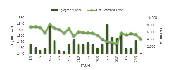 Organize Toptan Doğal Gaz Satış Piyasası (OTSP) dahilinde 01.06.2019 – 24.06.2019 tarihleri arası ortalama Gaz Referans Fiyatı (GRF) 1,509.16 TL/1000 sm3 olarak belirlenirken, aynı tarihler arasında toplam gerçekleşen eşleşmelerin miktarı ise 72,991 x1000 sm3 olarak belirlendi. İlgili tarihler arasında günlük Gaz Referans Fiyatı (GRF) ile Eşleşme Miktarı verileri aşağıdaki grafikte yer almaktadır.