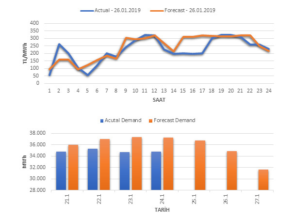 Tahminleme Modeli* analizi sonucu ortalama piyasa takas fiyatı 243.7 TL/MWh ve ortalama tüketim 34,895 MWh olarak öngörülmektedir. Modelin piyasa takas fiyatına dair başarı oranı günlük % 80, tüketime dair başarı oranı** ise günlük % 93 olarak hesaplanırken, bugüne kadar yapılan piyasa takas fiyatına dair analizlere göre başarı oranı % 88, tüketime dair başarı oranı ise % 94 olarak hesaplanmaktadır. Saatlik yarın için oluşan ve tahmin edilen piyasa takas fiyatları ile haftalık bazda tahmin edilen ve gerçekleştikçe yer alacak günlük ortalama tüketim değerleri aşağıdaki grafiklerde yer almaktadır.