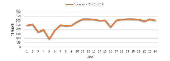 Yarından sonraki gün için oluşacak ortalama piyasa takas fiyatı 271.04 TL/MWH olarak tahmin edilmektedir. Buna bağlı olarak günün maksimum fiyatı 319.21 TL/MWh olarak 18:00 – 19:00 saat aralığında, minimum fiyatı 95.28 TL/MWh olarak 04:00 – 05:00 saat aralığında gerçekleşeceği öngörülmektedir. Puant saatlerde (17:00 – 22:00) tahmini ortalama piyasa takas fiyatı ise 314.21 TL/MWh olarak hesaplanabilmektedir. Saatlik oluşacak piyasa takas fiyatı tahminleri aşağıdaki grafikte yer almaktadır.