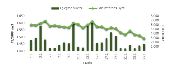 Organize Toptan Doğal Gaz Satış Piyasası (OTSP) dahilinde 01.12.2018 – 25.01.2019 tarihleri arası ortalama Gaz Referans Fiyatı (GRF) 1,567.17 TL/1000 sm3 olarak belirlenirken, aynı tarihler arasında toplam gerçekleşen eşleşmelerin miktarı ise 62,342 x1000 sm3 olarak belirlendi. İlgili tarihler arasında günlük Gaz Referans Fiyatı (GRF) ile Eşleşme Miktarı verileri aşağıdaki grafikte yer almaktadır.