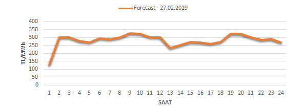 Yarından sonraki gün için oluşacak ortalama piyasa takas fiyatı 282.47 TL/MWH olarak tahmin edilmektedir. Buna bağlı olarak günün maksimum fiyatı 327.42 TL/MWh olarak 08:0009:00 saat aralığında, minimum fiyatı 127.72 TL/MWh olarak :0001:00 saat aralığında gerçekleşeceği öngörülmektedir. Puant saatlerde (17:0022:00) tahmini ortalama piyasa takas fiyatı ise 299.83 TL/MWh olarak hesaplanabilmektedir. Saatlik oluşacak piyasa takas fiyatı tahminleri aşağıdaki grafikte yer almaktadır.