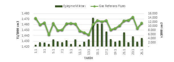 Organize Toptan Doğal Gaz Satış Piyasası (OTSP) dahilinde 01.02.201925.02.2019 tarihleri arası ortalama Gaz Referans Fiyatı (GRF) 1,458.87 TL/1000 sm3 olarak belirlenirken, aynı tarihler arasında toplam gerçekleşen eşleşmelerin miktarı ise 102,129 x1000 sm3 olarak belirlendi. İlgili tarihler arasında günlük Gaz Referans Fiyatı (GRF) ile Eşleşme Miktarı verileri aşağıdaki grafikte yer almaktadır.