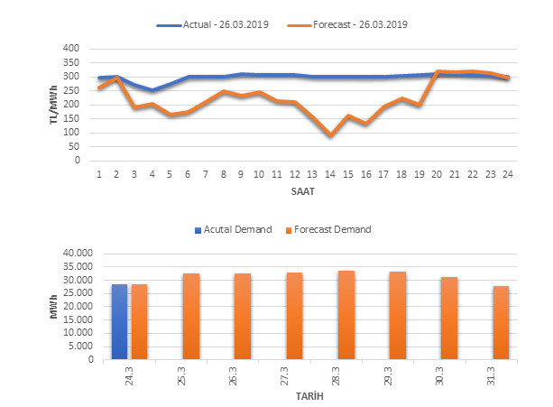 Tahminleme Modeli* analizi sonucu ortalama piyasa takas fiyatı 224.02 TL/MWh ve ortalama tüketim 32,556 MWh olarak öngörülmektedir. Modelin piyasa takas fiyatına dair başarı oranı günlük % 68, tüketime dair başarı oranı** ise günlük % 99 olarak hesaplanırken, bugüne kadar yapılan piyasa takas fiyatına dair analizlere göre başarı oranı % 88, tüketime dair başarı oranı ise % 95 olarak hesaplanmaktadır. Saatlik yarın için oluşan ve tahmin edilen piyasa takas fiyatları ile haftalık bazda tahmin edilen ve gerçekleştikçe yer alacak günlük ortalama tüketim değerleri aşağıdaki grafiklerde yer almaktadır.