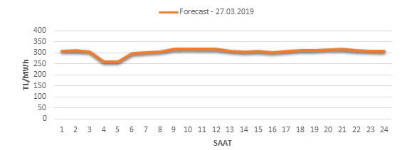 Yarından sonraki gün için oluşacak ortalama piyasa takas fiyatı 303.82 TL/MWH olarak tahmin edilmektedir. Buna bağlı olarak günün maksimum fiyatı 316.07 TL/MWh olarak 09:00 – 10:00 saat aralığında, minimum fiyatı 258.61 TL/MWh olarak 03:00 – 04:00 saat aralığında gerçekleşeceği öngörülmektedir. Puant saatlerde (17:00 – 22:00) tahmini ortalama piyasa takas fiyatı ise 310.94 TL/MWh olarak hesaplanabilmektedir. Saatlik oluşacak piyasa takas fiyatı tahminleri aşağıdaki grafikte yer almaktadır.