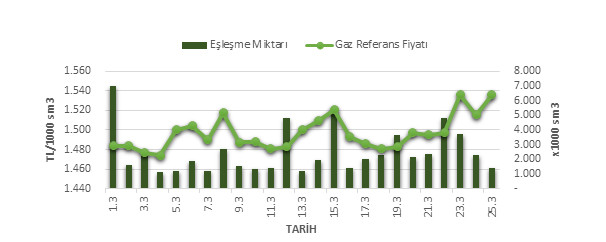 Organize Toptan Doğal Gaz Satış Piyasası (OTSP) dahilinde 01.03.2019 – 25.03.2019 tarihleri arası ortalama Gaz Referans Fiyatı (GRF) 1,497.02 TL/1000 sm3 olarak belirlenirken, aynı tarihler arasında toplam gerçekleşen eşleşmelerin miktarı ise 62,687 x1000 sm3 olarak belirlendi. İlgili tarihler arasında günlük Gaz Referans Fiyatı (GRF) ile Eşleşme Miktarı verileri aşağıdaki grafikte yer almaktadır.