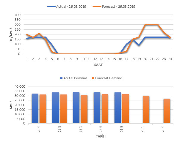 Tahminleme Modeli* analizi sonucu ortalama piyasa takas fiyatı 100.78 TL/MWh ve ortalama tüketim 26,748 MWh olarak öngörülmektedir. Modelin piyasa takas fiyatına dair başarı oranı günlük % 68, tüketime dair başarı oranı** ise günlük % 94 olarak hesaplanırken, bugüne kadar yapılan piyasa takas fiyatına dair analizlere göre başarı oranı % 88, tüketime dair başarı oranı ise % 95 olarak hesaplanmaktadır. Saatlik yarın için oluşan ve tahmin edilen piyasa takas fiyatları ile haftalık bazda tahmin edilen ve gerçekleştikçe yer alacak günlük ortalama tüketim değerleri aşağıdaki grafiklerde yer almaktadır.