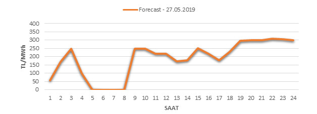 Yarından sonraki gün için oluşacak ortalama piyasa takas fiyatı 190.82 TL/MWH olarak tahmin edilmektedir. Buna bağlı olarak günün maksimum fiyatı 310.13 TL/MWh olarak 21:00 – 22:00 saat aralığında, minimum fiyatı 0.01 TL/MWh olarak 06:00 – 07:00 saat aralığında gerçekleşeceği öngörülmektedir. Puant saatlerde (17:00 – 22:00) tahmini ortalama piyasa takas fiyatı ise 291.28 TL/MWh olarak hesaplanabilmektedir. Saatlik oluşacak piyasa takas fiyatı tahminleri aşağıdaki grafikte yer almaktadır.