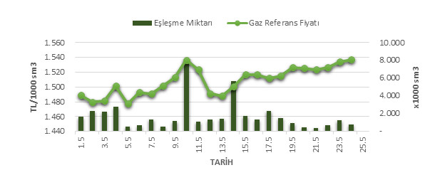 Organize Toptan Doğal Gaz Satış Piyasası (OTSP) dahilinde 01.05.2019 – 25.05.2019 tarihleri arası ortalama Gaz Referans Fiyatı (GRF) 1,508.7 TL/1000 sm3 olarak belirlenirken, aynı tarihler arasında toplam gerçekleşen eşleşmelerin miktarı ise 42,498 x1000 sm3 olarak belirlendi. İlgili tarihler arasında günlük Gaz Referans Fiyatı (GRF) ile Eşleşme Miktarı verileri aşağıdaki grafikte yer almaktadır.