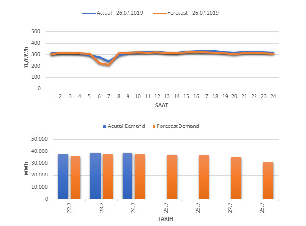 Tahminleme Modeli* analizi sonucu ortalama piyasa takas fiyatı 304.45 TL/MWh ve ortalama tüketim 36,619 MWh olarak öngörülmektedir. Modelin piyasa takas fiyatına dair başarı oranı günlük % 83, tüketime dair başarı oranı** ise günlük % 97 olarak hesaplanırken, bugüne kadar yapılan piyasa takas fiyatına dair analizlere göre başarı oranı % 91, tüketime dair başarı oranı ise % 94 olarak hesaplanmaktadır. Saatlik yarın için oluşan ve tahmin edilen piyasa takas fiyatları ile haftalık bazda tahmin edilen ve gerçekleştikçe yer alacak günlük ortalama tüketim değerleri aşağıdaki grafiklerde yer almaktadır.