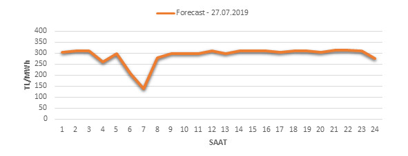 Yarından sonraki gün için oluşacak ortalama piyasa takas fiyatı 292.03 TL/MWH olarak tahmin edilmektedir. Buna bağlı olarak günün maksimum fiyatı 314.59 TL/MWh olarak 21:00 – 22:00 saat aralığında, minimum fiyatı 140 TL/MWh olarak 06:00 – 07:00 saat aralığında gerçekleşeceği öngörülmektedir. Puant saatlerde (17:00 – 22:00) tahmini ortalama piyasa takas fiyatı ise 310.82 TL/MWh olarak hesaplanabilmektedir. Saatlik oluşacak piyasa takas fiyatı tahminleri aşağıdaki grafikte yer almaktadır.