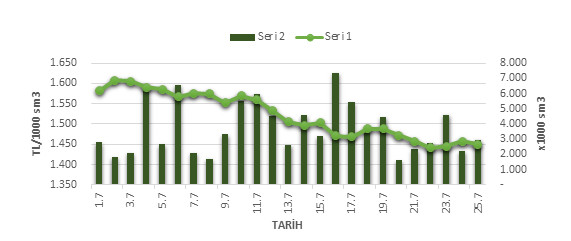 Organize Toptan Doğal Gaz Satış Piyasası (OTSP) dahilinde 01.07.2019 – 25.07.2019 tarihleri arası ortalama Gaz Referans Fiyatı (GRF) 1,521.91 TL/1000 sm3 olarak belirlenirken, aynı tarihler arasında toplam gerçekleşen eşleşmelerin miktarı ise 93,166 x1000 sm3 olarak belirlendi. İlgili tarihler arasında günlük Gaz Referans Fiyatı (GRF) ile Eşleşme Miktarı verileri aşağıdaki grafikte yer almaktadır.