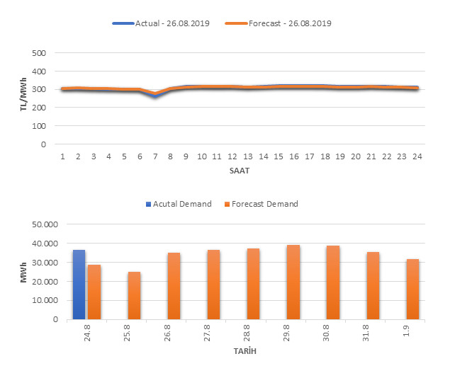 Tahminleme Modeli* analizi sonucu ortalama piyasa takas fiyatı 309.12 TL/MWh ve ortalama tüketim 35,004 MWh olarak öngörülmektedir. Modelin piyasa takas fiyatına dair başarı oranı günlük % 92, tüketime dair başarı oranı** ise günlük % 78 olarak hesaplanırken, bugüne kadar yapılan piyasa takas fiyatına dair analizlere göre başarı oranı % 91, tüketime dair başarı oranı ise % 94 olarak hesaplanmaktadır. Saatlik yarın için oluşan ve tahmin edilen piyasa takas fiyatları ile haftalık bazda tahmin edilen ve gerçekleştikçe yer alacak günlük ortalama tüketim değerleri aşağıdaki grafiklerde yer almaktadır.