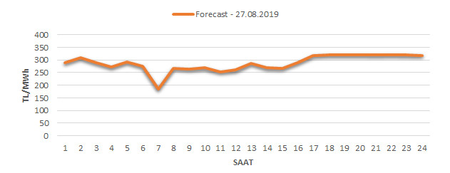 Yarından sonraki gün için oluşacak ortalama piyasa takas fiyatı 286.21 TL/MWH olarak tahmin edilmektedir. Buna bağlı olarak günün maksimum fiyatı 319.32 TL/MWh olarak 18:00 – 19:00 saat aralığında, minimum fiyatı 185.21 TL/MWh olarak 06:00 – 07:00 saat aralığında gerçekleşeceği öngörülmektedir. Puant saatlerde (17:00 – 22:00) tahmini ortalama piyasa takas fiyatı ise 318.76 TL/MWh olarak hesaplanabilmektedir. Saatlik oluşacak piyasa takas fiyatı tahminleri aşağıdaki grafikte yer almaktadır.