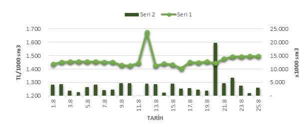 Organize Toptan Doğal Gaz Satış Piyasası (OTSP) dahilinde 01.08.2019 – 25.08.2019 tarihleri arası ortalama Gaz Referans Fiyatı (GRF) 1,461.93 TL/1000 sm3 olarak belirlenirken, aynı tarihler arasında toplam gerçekleşen eşleşmelerin miktarı ise 96,050 x1000 sm3 olarak belirlendi. İlgili tarihler arasında günlük Gaz Referans Fiyatı (GRF) ile Eşleşme Miktarı verileri aşağıdaki grafikte yer almaktadır.