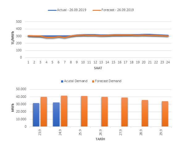 Tahminleme Modeli* analizi sonucu ortalama piyasa takas fiyatı 305.28 TL/MWh ve ortalama tüketim 39,973 MWh olarak öngörülmektedir. Modelin piyasa takas fiyatına dair başarı oranı günlük % 60, tüketime dair başarı oranı** ise günlük % 73 olarak hesaplanırken, bugüne kadar yapılan piyasa takas fiyatına dair analizlere göre başarı oranı % 91, tüketime dair başarı oranı ise % 94 olarak hesaplanmaktadır. Saatlik yarın için oluşan ve tahmin edilen piyasa takas fiyatları ile haftalık bazda tahmin edilen ve gerçekleştikçe yer alacak günlük ortalama tüketim değerleri aşağıdaki grafiklerde yer almaktadır.