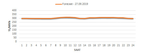 Yarından sonraki gün için oluÅŸacak ortalama piyasa takas fiyatı 305.82 TL/MWH olarak tahmin edilmektedir. Buna baÄŸlı olarak günün maksimum fiyatı 314.46 TL/MWh olarak 09:00 – 10:00 saat aralığında, minimum fiyatı 298 TL/MWh olarak 05:00 – 06:00 saat aralığında gerçekleÅŸeceÄŸi öngörülmektedir. Puant saatlerde (17:00 – 22:00) tahmini ortalama piyasa takas fiyatı ise 308.9 TL/MWh olarak hesaplanabilmektedir. Saatlik oluÅŸacak piyasa takas fiyatı tahminleri aÅŸağıdaki grafikte yer almaktadır.