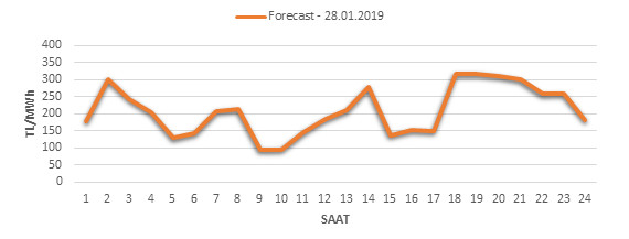 Yarından sonraki gün için oluşacak ortalama piyasa takas fiyatı 209.88 TL/MWH olarak tahmin edilmektedir. Buna bağlı olarak günün maksimum fiyatı 317.66 TL/MWh olarak 18:0019:00 saat aralığında, minimum fiyatı 95.83 TL/MWh olarak 08:0009:00 saat aralığında gerçekleşeceği öngörülmektedir. Puant saatlerde (17:0022:00) tahmini ortalama piyasa takas fiyatı ise 294.41 TL/MWh olarak hesaplanabilmektedir. Saatlik oluşacak piyasa takas fiyatı tahminleri aşağıdaki grafikte yer almaktadır.
