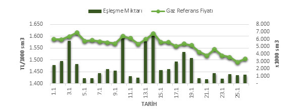 Organize Toptan Doğal Gaz Satış Piyasası (OTSP) dahilinde 01.12.201826.01.2019 tarihleri arası ortalama Gaz Referans Fiyatı (GRF) 1,564.77 TL/1000 sm3 olarak belirlenirken, aynı tarihler arasında toplam gerçekleşen eşleşmelerin miktarı ise 62,967 x1000 sm3 olarak belirlendi. İlgili tarihler arasında günlük Gaz Referans Fiyatı (GRF) ile Eşleşme Miktarı verileri aşağıdaki grafikte yer almaktadır.