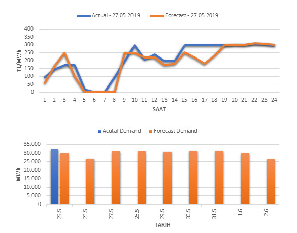 Tahminleme Modeli* analizi sonucu ortalama piyasa takas fiyatı 190.82 TL/MWh ve ortalama tüketim 31,203 MWh olarak öngörülmektedir. Modelin piyasa takas fiyatına dair başarı oranı günlük % 84, tüketime dair başarı oranı** ise günlük % 93 olarak hesaplanırken, bugüne kadar yapılan piyasa takas fiyatına dair analizlere göre başarı oranı % 88, tüketime dair başarı oranı ise % 95 olarak hesaplanmaktadır. Saatlik yarın için oluşan ve tahmin edilen piyasa takas fiyatları ile haftalık bazda tahmin edilen ve gerçekleştikçe yer alacak günlük ortalama tüketim değerleri aşağıdaki grafiklerde yer almaktadır.
